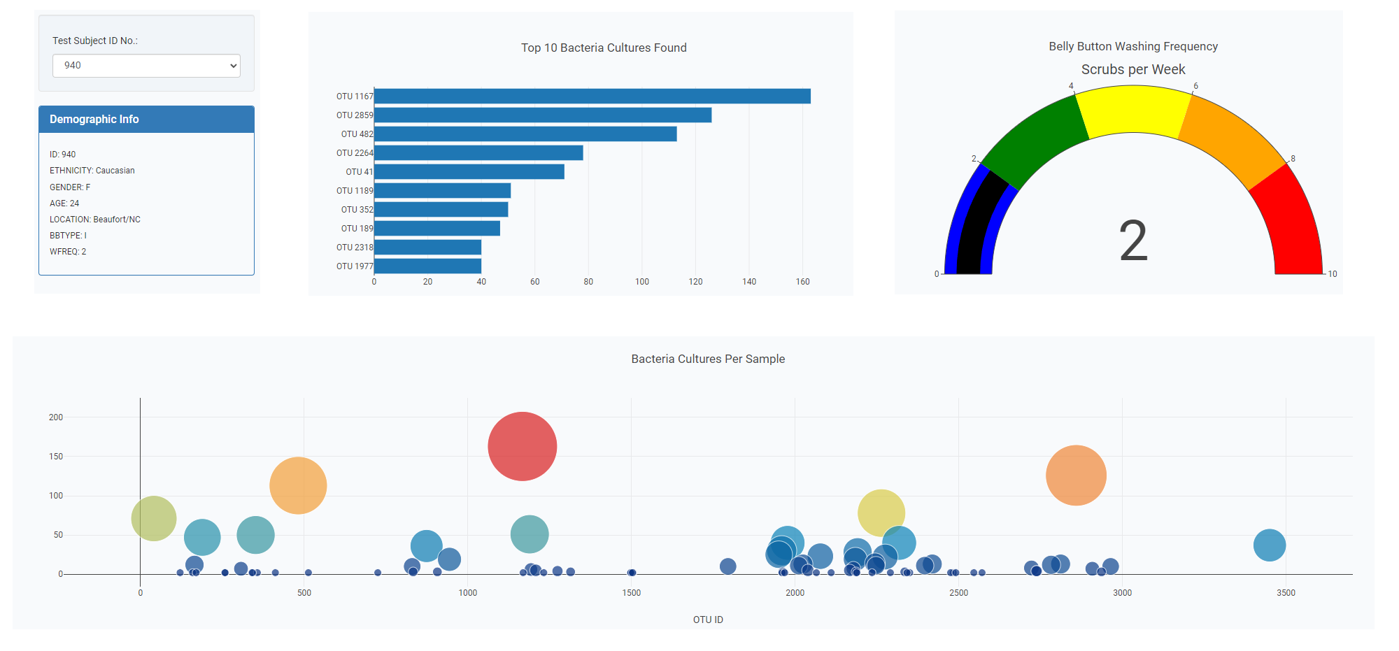 Responsive and interactive dashboard for data visualizations of types of bacteria found within belly buttons.