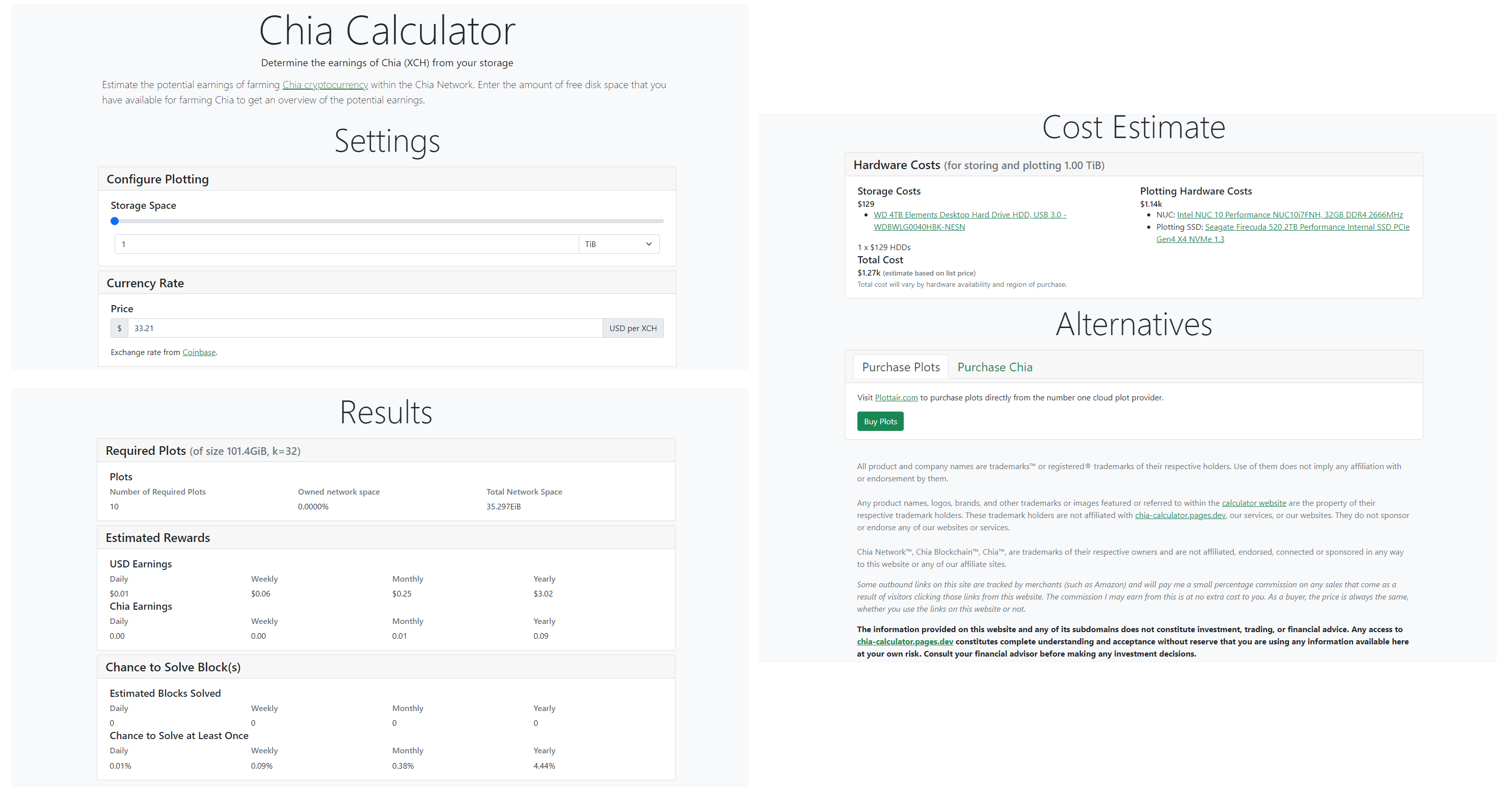 Estimate the potential earnings of farming Chia cryptocurrency within the Chia Network. Calculates the required number of plots, estimated rewards, and probability of solving a block.