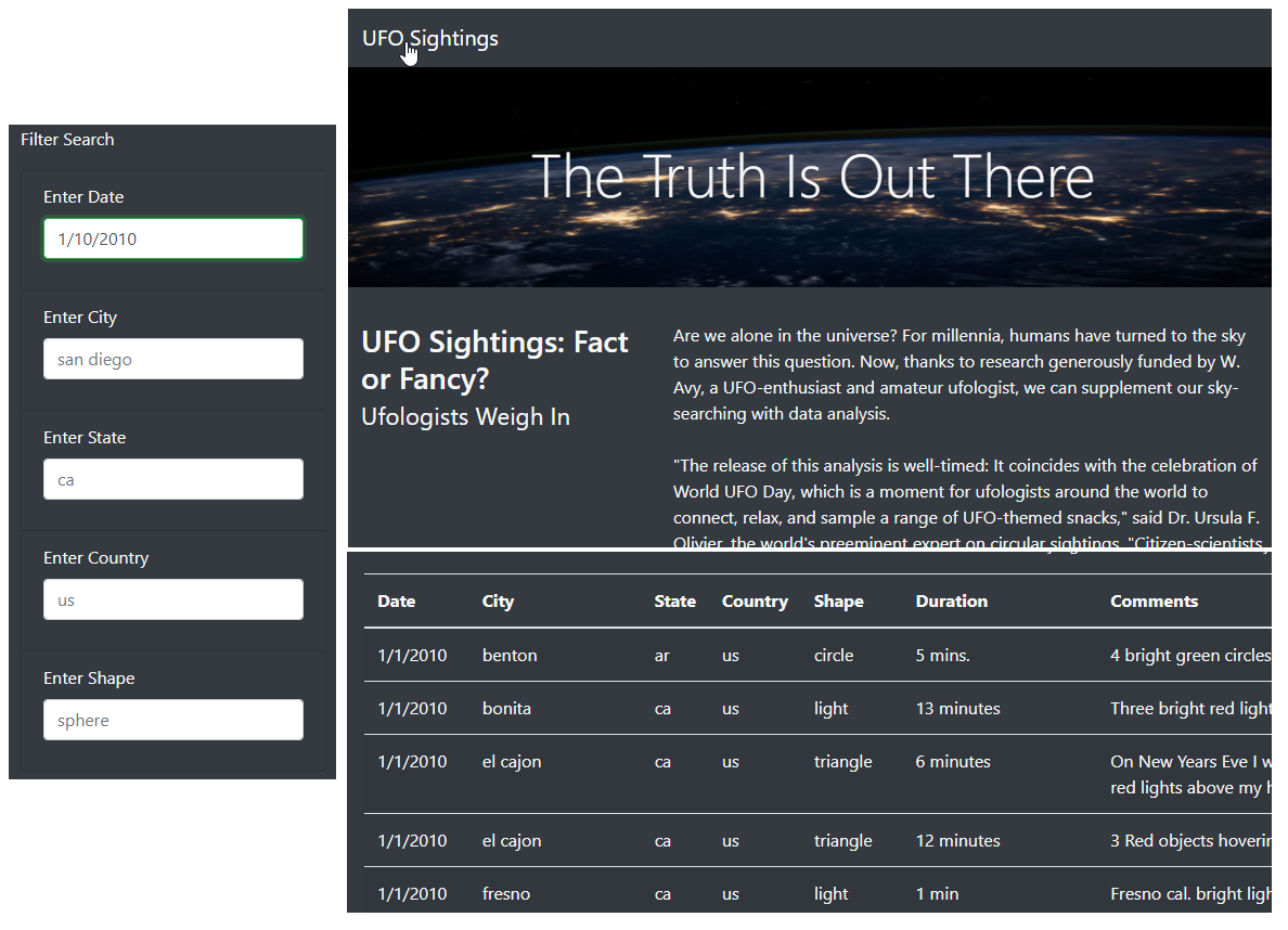 Interactive dashboard to analyze UFO sighting data and allow users to filter for criteria of city, state, country, and shape.