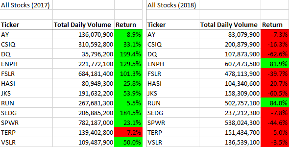 Analysis of stock data from 2017 and 2018 to calculate the yearly return and total daily volume of green energy companies. I made a subroutine to conduct the analysis and then refactored for optimization within larger datasets.